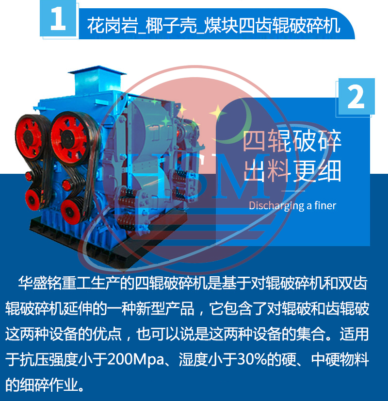 【產(chǎn)品價(jià)格】: 電議/面議???【生產(chǎn)能力】: 2-500t/小時(shí) 【進(jìn)料粒度】:?≤90mm???【出料粒度】:??≤0.1-50mm? 【應(yīng)用范圍】: ?四輥破碎機(jī)適用于抗壓強(qiáng)度小于200Mpa、濕度小于30%的硬、中硬物料的細(xì)碎作業(yè)。如焦炭、煤、陶瓷原料、石英石、石灰石、長石、水渣、石膏、粘土等固體物料。? 【產(chǎn)品介紹】: ?華盛銘重工生產(chǎn)的四輥破碎機(jī)是基于對輥破碎機(jī)和雙齒輥破碎機(jī)延伸的一種新型產(chǎn)品,它包含了對輥破和齒輥破這兩種設(shè)備的優(yōu)點(diǎn),也可以說是這兩種設(shè)備的集合。本機(jī)器具有使用維修費(fèi)特低、破碎比大、性能可靠、粉塵少、噪音低等特點(diǎn)。